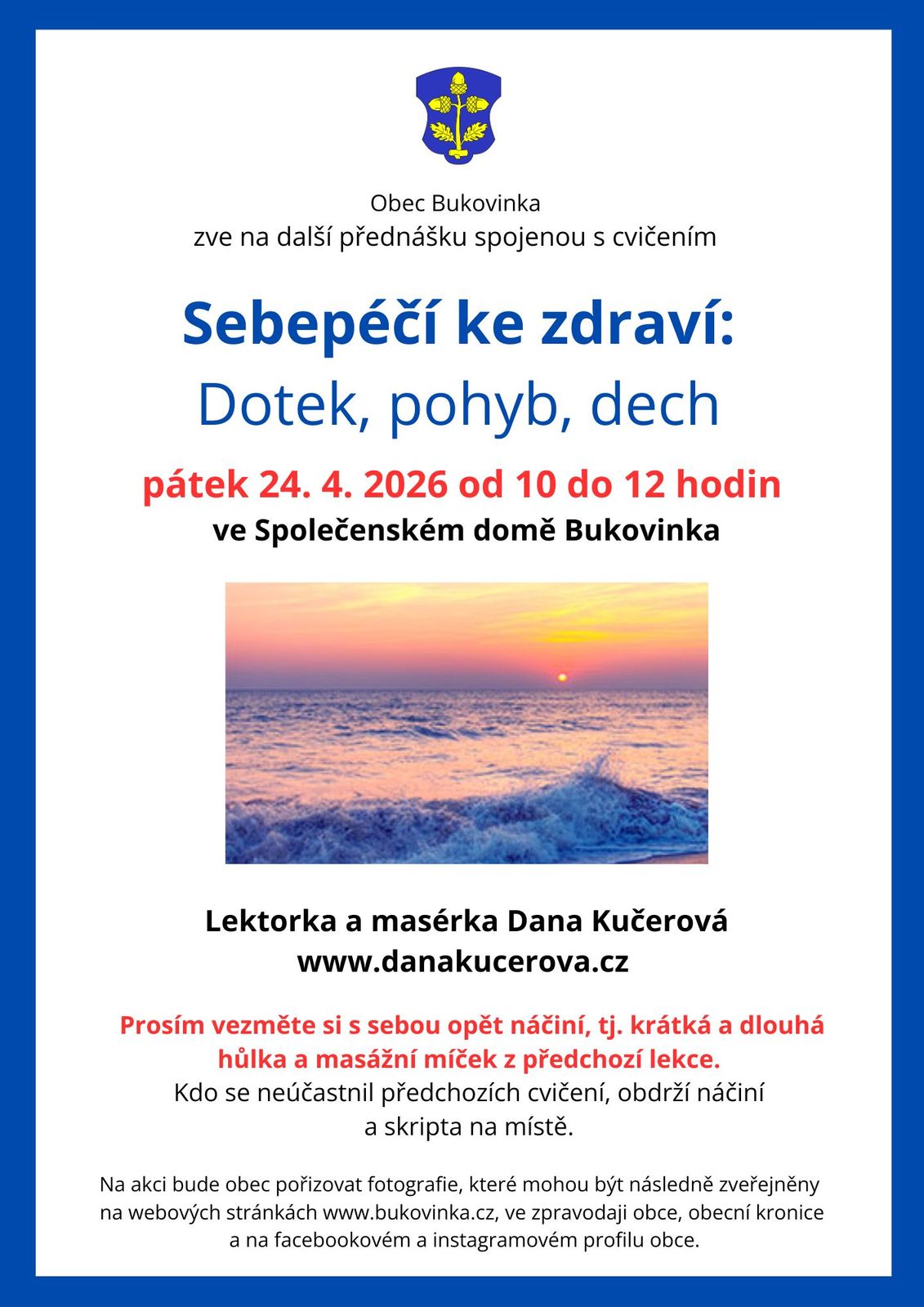 Obec Bukovinka zve na další přednášku spojenou se cvičením Sebepéčí ke zdraví: Dotek, pohyb, dech, která se uskuteční tento pátek 24. dubna 2026 od 10 do 12 hodin ve Společenském domě Bukovinka.