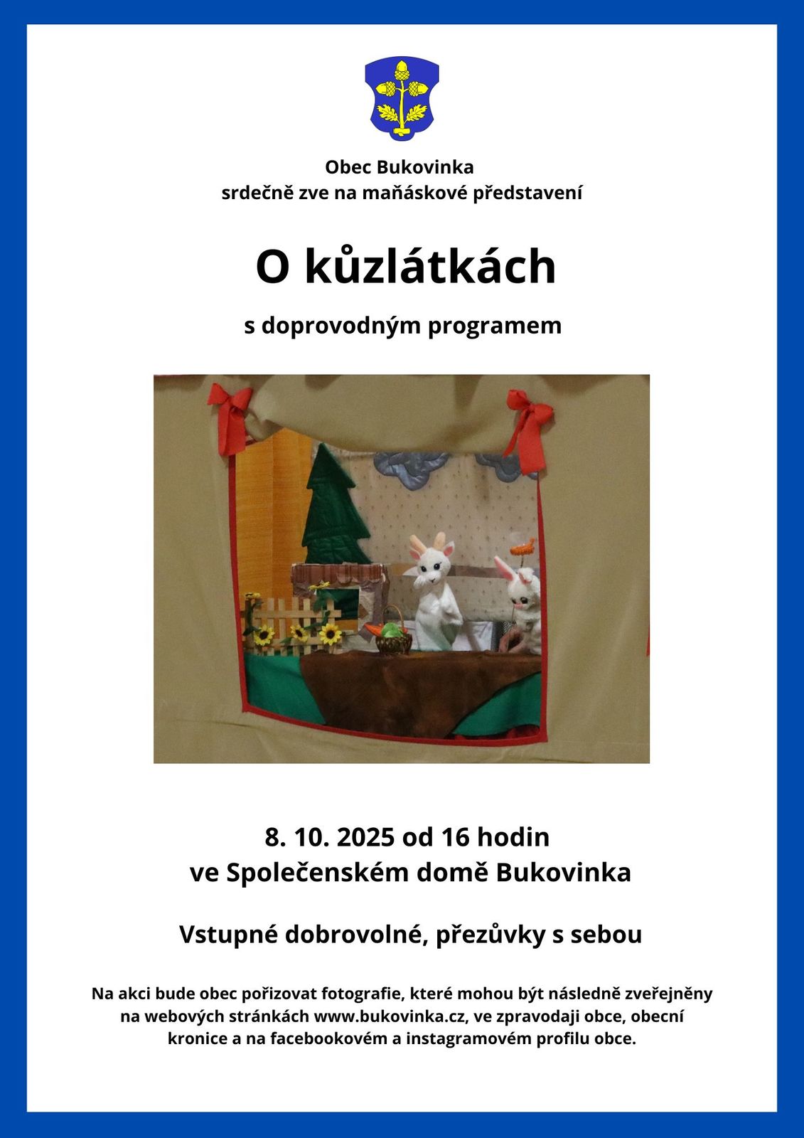 Srdečně zveme všechny děti a jejich rodiče na maňáskové představení, které se uskuteční ve středu 8. 10. 2025 od 16 hodin ve Společenském domě Bukovinka. Tentokrát se jedná o pohádku O KŮZLÁTKÁCH a součástí bude jako tradičně i doprovodný program pro děti.