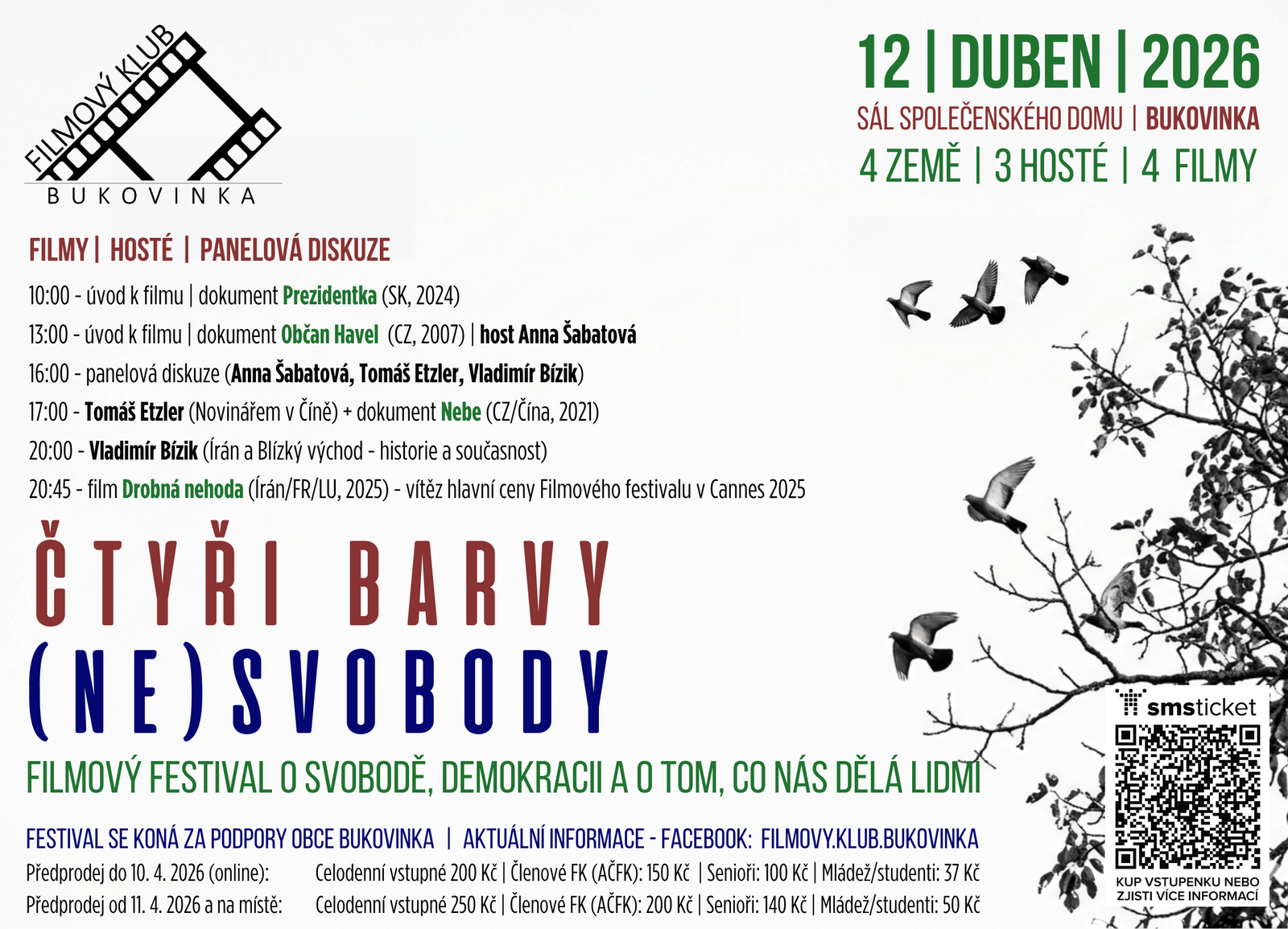 zveme vás v neděli 12. 4. do sálu Společenského domu v Bukovince na celodenní filmový festival ČTYŘI BARVY (NE)SVOBODY. Čeká nás den o svobodě, demokracii a o tom, co nás dělá lidmi.