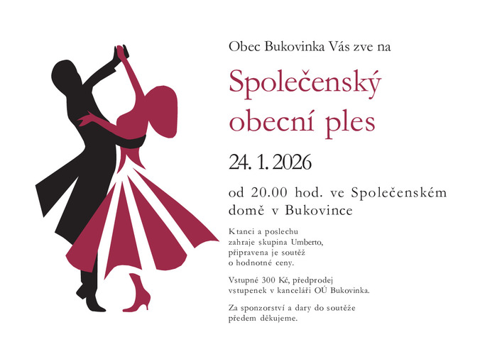Srdečně Vás zveme na Společenský obecní ples, který se bude konat v sobotu 24. ledna 2026.