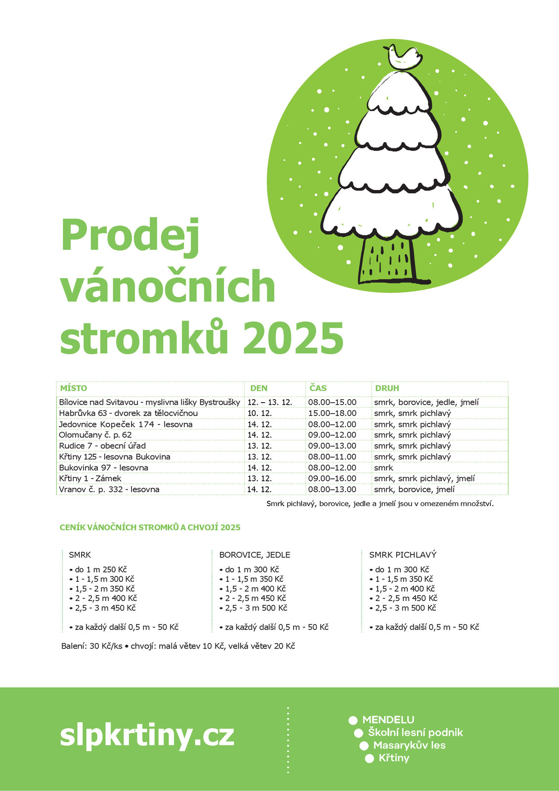 Prodej vánočních stromků (smrk) proběhne na hájence v Bukovince č.p. 97 (směr na Jedovnice) dne 14.12.2025 od 8:00 do 12:00 hod.