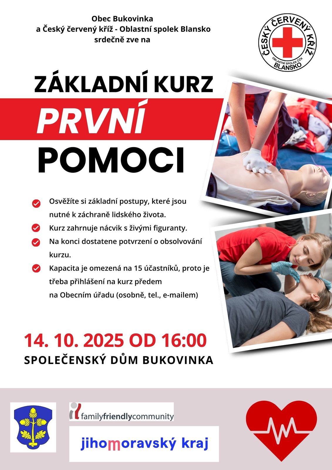 Obec Bukovinka i v tomto roce pořádá pro své občany základní kurz první pomoci - plakát zde, který proběhne v úterý 14. 10. 2025 od 16:00 hod. ve Společenském domě Bukovinka.