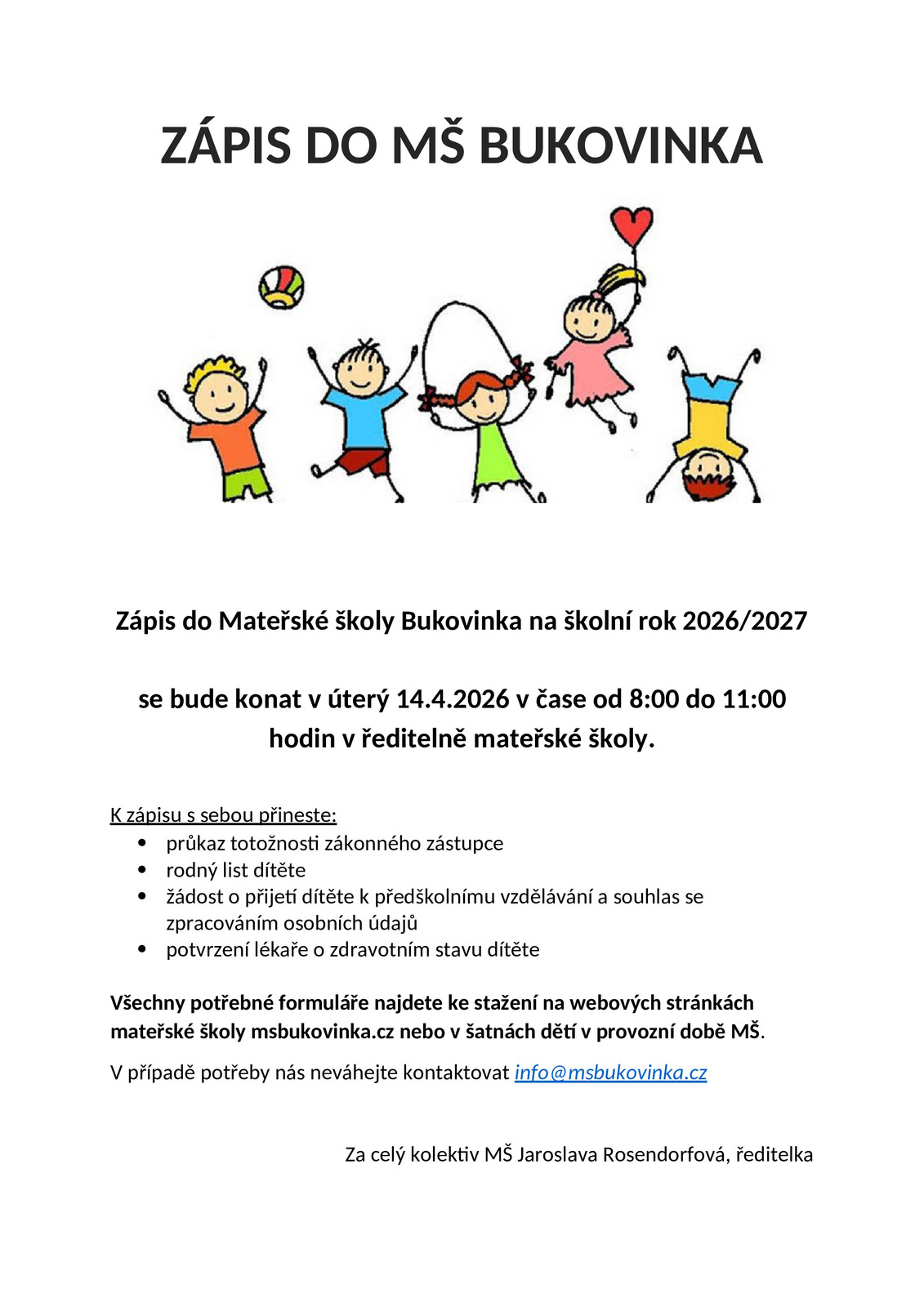 Informujeme, že zápis do Mateřské školy Bukovinka na školní rok 2026/2027 se bude konat