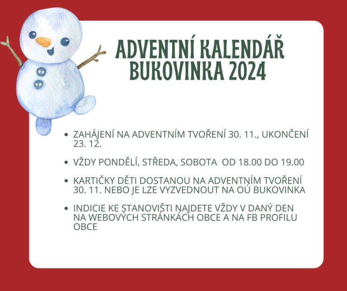 Děti na tvoření dostanou (nebo si mohou poté na Obecním úřadě v úředních hodinách vyzvednout) kartičky, s kterými si mohou obejít každé prosincové pondělí, středu a sobotu od 18.00 do 19.00 hodin různá stanoviště v obci. I pokud se vám nepodaří obejít všechna stanoviště, budeme rádi, když se zapojíte a užijete si společný předvánoční čas procházkou po Bukovince.